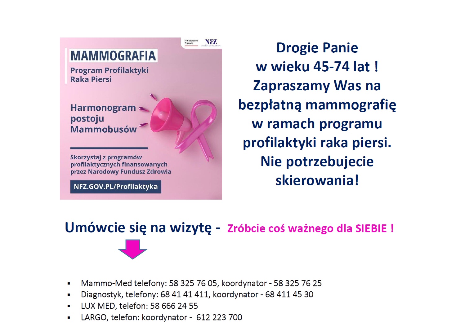 5 październik – Szczaniec, ul. Herbowa 1, przy stadionie, od 9.00 do 14.00, MAMMO-MED